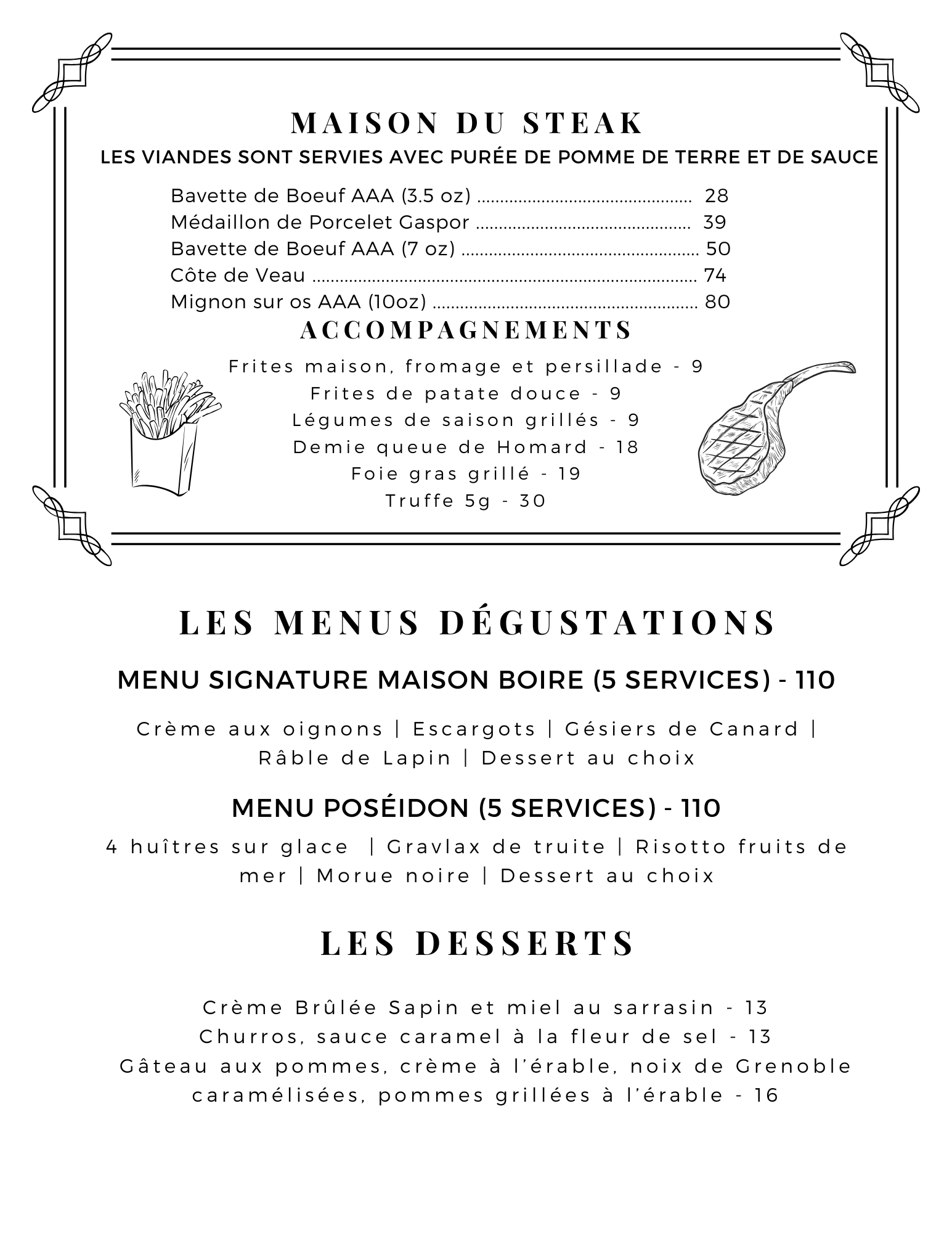 Profitez de notre offre exclusive de bavette et ses accompagnements à volonté pour seulement 60$!